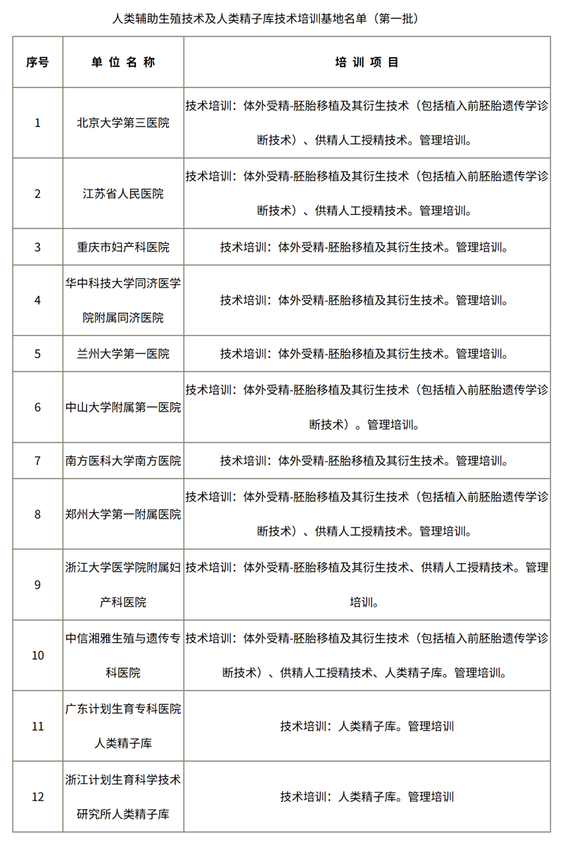 为规范和促进我国人类辅助生殖技术和人类精子库技术的应用和发展,加强对上述技术应用的管理与监督,提高管理和技术人员的工作水平,依据《人类辅助生殖技术管理办法》、《人类精子库管理办法》(以下简称两个《办法》)和《人类辅助生殖技术与人类精子库培训基地认可标准及管理规定》(以下简称《培训基地规定》)的要求,我部组织专家对有关省、自治区、直辖市推荐申报拟开展人类辅助生殖技术和人类精子库技术培训的机构进行了评审,确定了北京大学第三医院等12家机构作为第一批人类辅助生殖技术和人类精子库技术培训基地,现将培训基地名单予以公布,并将有关事宜通知如下: