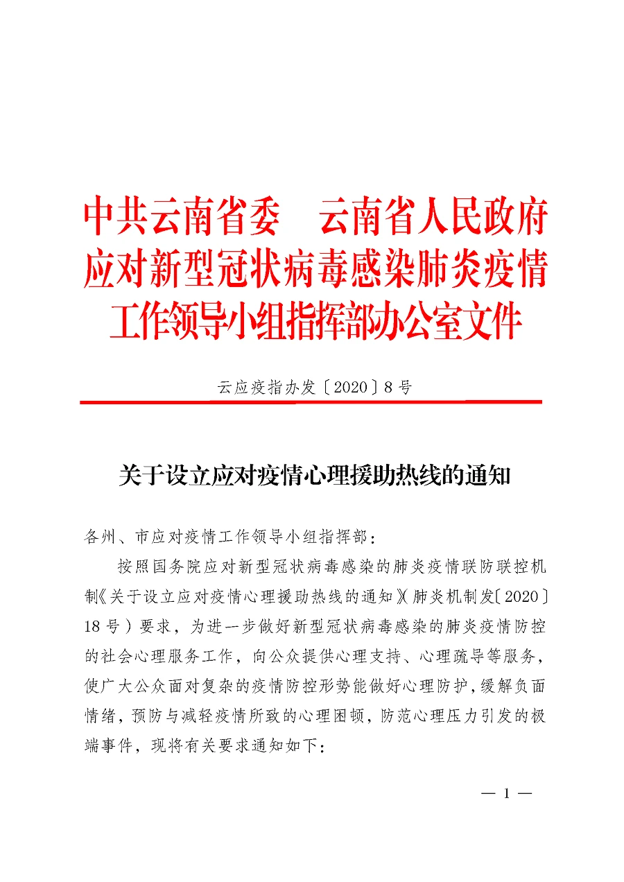 云南省应对疫情工作领导小组指挥部关于设立应对疫情心理援助热线的通知