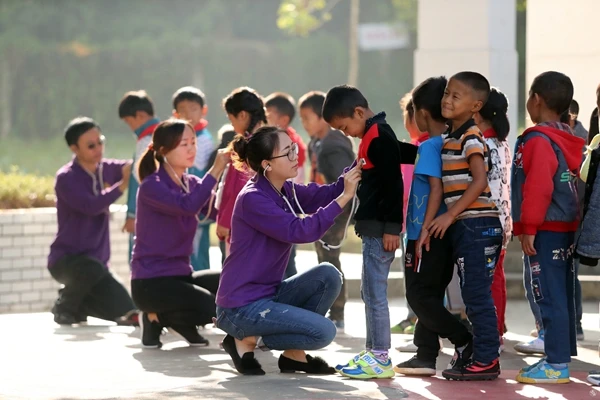 云南阜外心血管病医院筛查队员正在为边远山区小学进行先心病筛查
