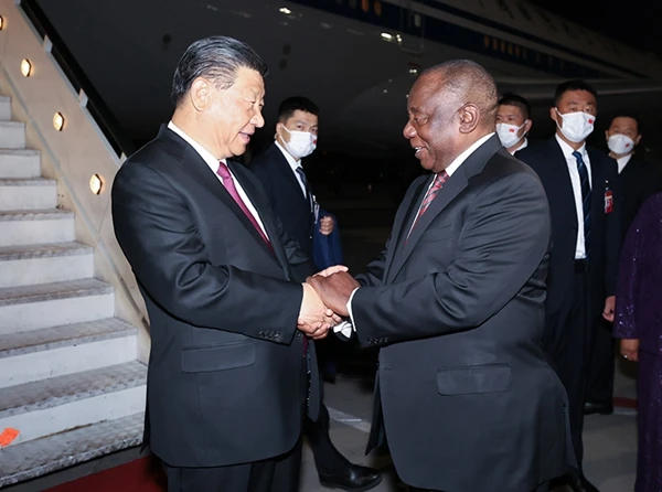 当地时间8月21日晚,国家主席习近平抵达约翰内斯堡,出席金砖国家领导人第十五次会晤并对南非进行国事访问。这是习近平在机场受到南非总统拉马福萨等热情迎接。新华社记者 李学仁 摄