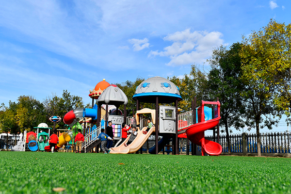在山东省东营市垦利区杨庙社区幼儿园,孩子们在老师的带领下进行户外活动(2021年10月19日摄)。新华社记者 郭绪雷 摄