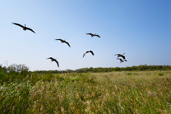 鸟类在山东黄河三角洲国家级自然保护区内飞翔(2022年9月18日摄)。新华社记者 范长国 摄