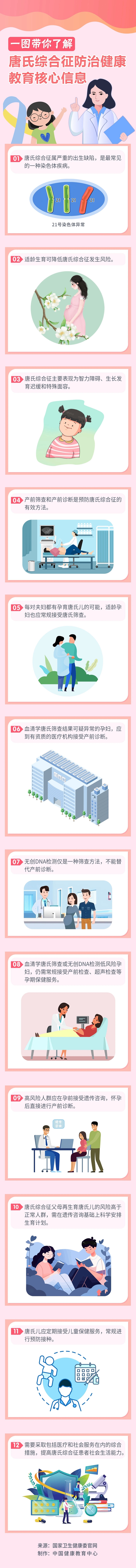 9月12日是预防出生缺陷日。2023年活动主题是:预防出生缺陷,科学健康孕育。为贯彻落实《健康中国行动(2019—2030年)》,加强出生缺陷防治社会宣传和健康教育,中国健康教育中心根据国家卫生健康委妇幼健康司发布的核心信息,制作了《唐氏综合征防治健康教育核心信息》长图,供相关机构和人群下载使用,旨在倡导科学预防理念,提高公众优生意识和健康素养,为做好出生缺陷防治工作营造良好社会氛围。