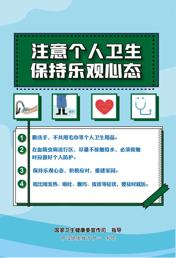 近日多地出现洪涝灾害,提醒广大公众洪涝灾害期间做好饮食卫生,保持卫生习惯,灾害过后注意环境卫生,预防疾病发生。