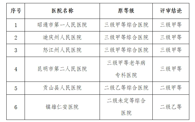 按照《医院评审暂行办法》《三级医院评审标准(2022年版)云南省实施细则(试行)》和相关规定,云南省卫生健康委于2025年5月—7月委托省医疗服务质量评估中心组织专家对昭通市第一人民医院等6所医院进行了评审,评审结果于2025年9月22日经云南省医院评审委员会审核通过,现予以公示:
