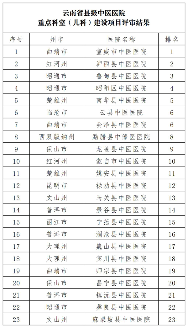 根据云南省卫生健康委员会办公室《关于开展县级中医医院重点科室(儿科)建设项目申报工作的通知》要求,我委组织开展了县级中医医院重点科室(儿科)建设项目的省级申报遴选工作,经单位申报、省级审核、专家评审、委主任办公会/党组会审议,拟将宣威市中医医院、泸西县中医医院等23家单位纳入项目建设。