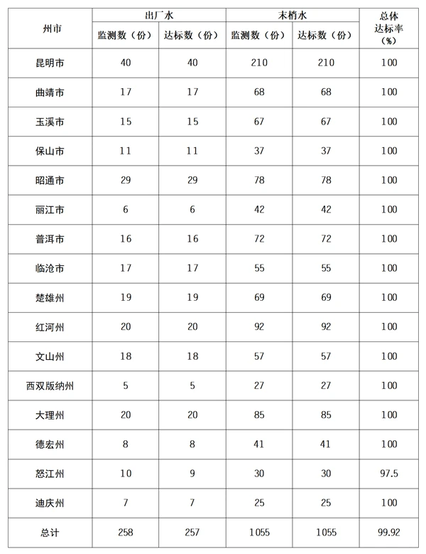 2025年第一季度,16州(市)129县(市、区)对258份出厂水、1055份水龙头水(末梢水)的菌落总数、总大肠菌群(检出时进一步检测大肠埃希氏菌)、色度、浑浊度、臭和味、肉眼可见物、高锰酸盐指数、消毒剂余量(游离氯、总氯和二氧化氯任何一项)进行检测,达标率为99.92%。各州(市)达标情况如下: