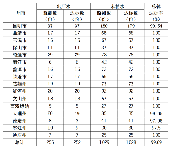 2025年第二季度,云南省16州(市)129县(市、区)对255份出厂水、1029份水龙头水(末梢水)的菌落总数、总大肠菌群(检出时进一步检测大肠埃希氏菌)、色度、浑浊度、臭和味、肉眼可见物、高锰酸盐指数、消毒剂余量(游离氯、总氯和二氧化氯任何一项)进行检测,达标率为99.69%。各州(市)达标情况如下: