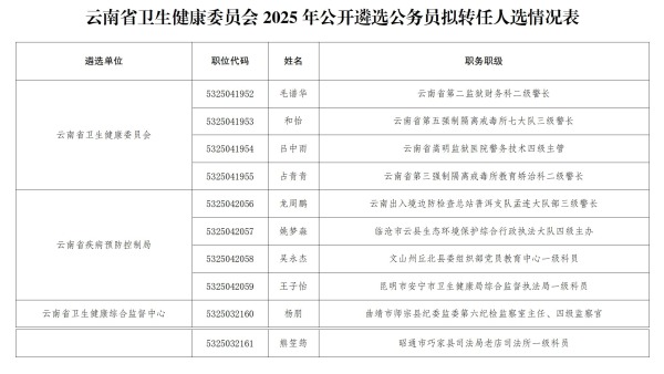 根据省委组织部统一安排部署,按照《中华人民共和国公务员法》和《公务员公开遴选办法》等相关规定,经过笔试、面试、体检、考察等工作程序,现将云南省卫生健康委员会2025年公开遴选公务员拟转任人选公示如下(详见附表)。