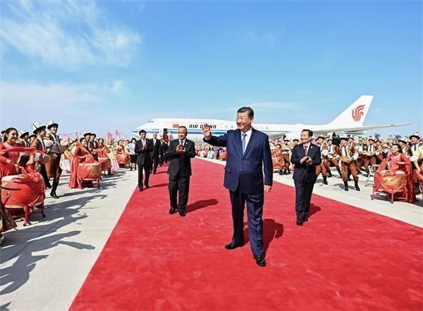新疆维吾尔自治区党委书记陈小江、自治区人民政府主席艾尔肯·吐尼亚孜、自治区人大常委会主任祖木热提·吾布力、自治区政协主席努尔兰·阿不都满金、新疆生产建设兵团政委何忠友等在舷梯下迎候。习近平走下舷梯时,少先队员献上鲜花。各族群众代表身着民族服饰,载歌载舞,欢迎总书记的到来,表达对总书记的衷心祝福。