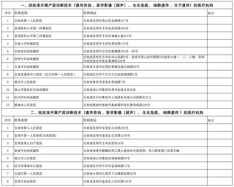 云南省经批准开展产前诊断技术的医疗机构名单表(截至2025年9月29日)
