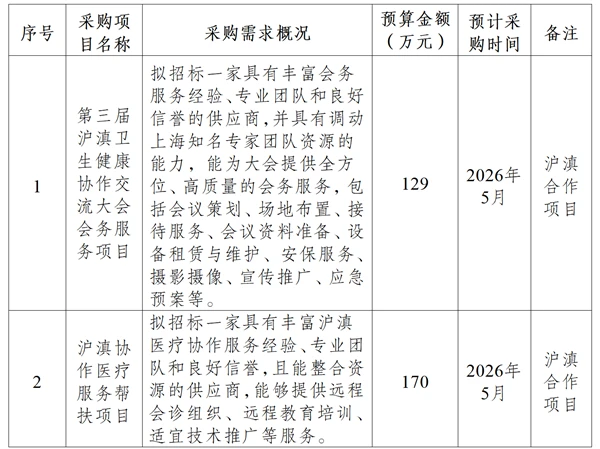 为便于供应商及时了解政府采购信息,根据《财政部关于开展政府采购意向公开工作的通知》(财库〔2020〕10号)等有关规定,现将云南省卫生健康委员会2026年4月至2026年5月政府采购意向公开如下: