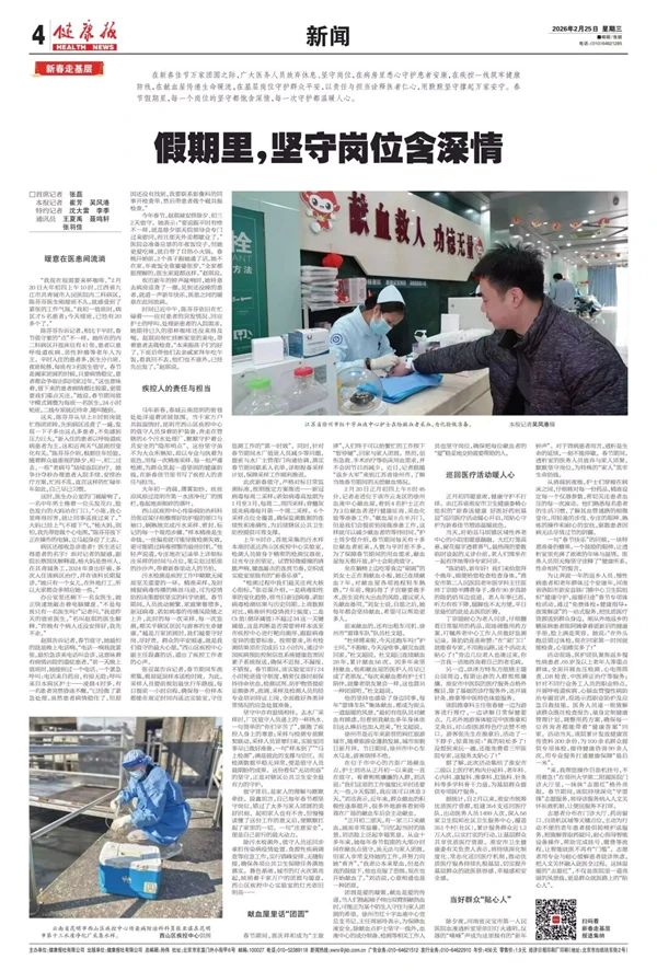 在新春佳节万家团圆之际,广大医务人员放弃休息、坚守岗位,在病房里悉心守护患者安康,在疾控一线筑牢健康防线,在献血屋传递生命暖流,在基层岗位守护群众平安,以责任与担当诠释医者仁心,用默默坚守撑起万家安宁。春节假期里,每一个岗位的坚守都饱含深情,每一次守护都温暖人心。