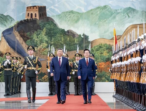 1月5日下午,国家主席习近平在北京人民大会堂同来华进行国事访问的韩国总统李在明举行会谈。这是会谈前,习近平在人民大会堂北大厅为李在明举行欢迎仪式。新华社记者 申宏 摄