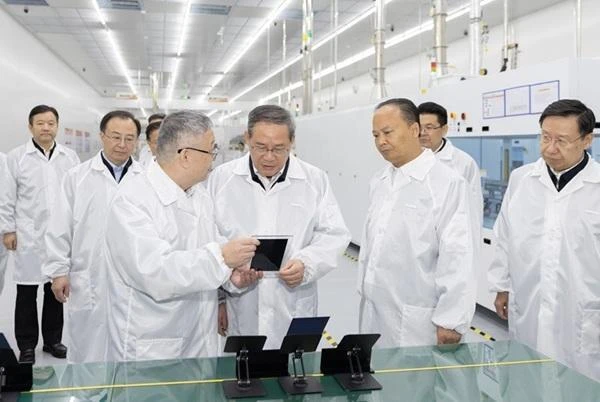 3月30日至4月1日,中共中央政治局常委、国务院总理李强在四川调研。这是3月30日,李强在通威全球创新研发中心听取光伏技术攻关介绍,进入车间察看电池组件研制情况。新华社记者 黄敬文 摄