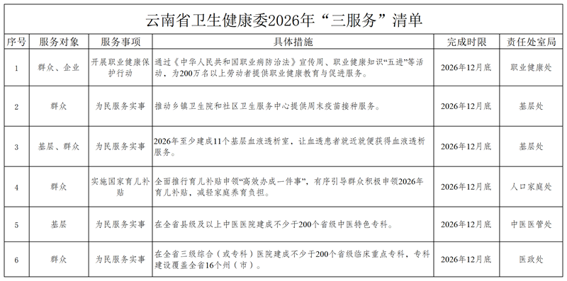 云南省卫生健康委2026年“三服务”清单