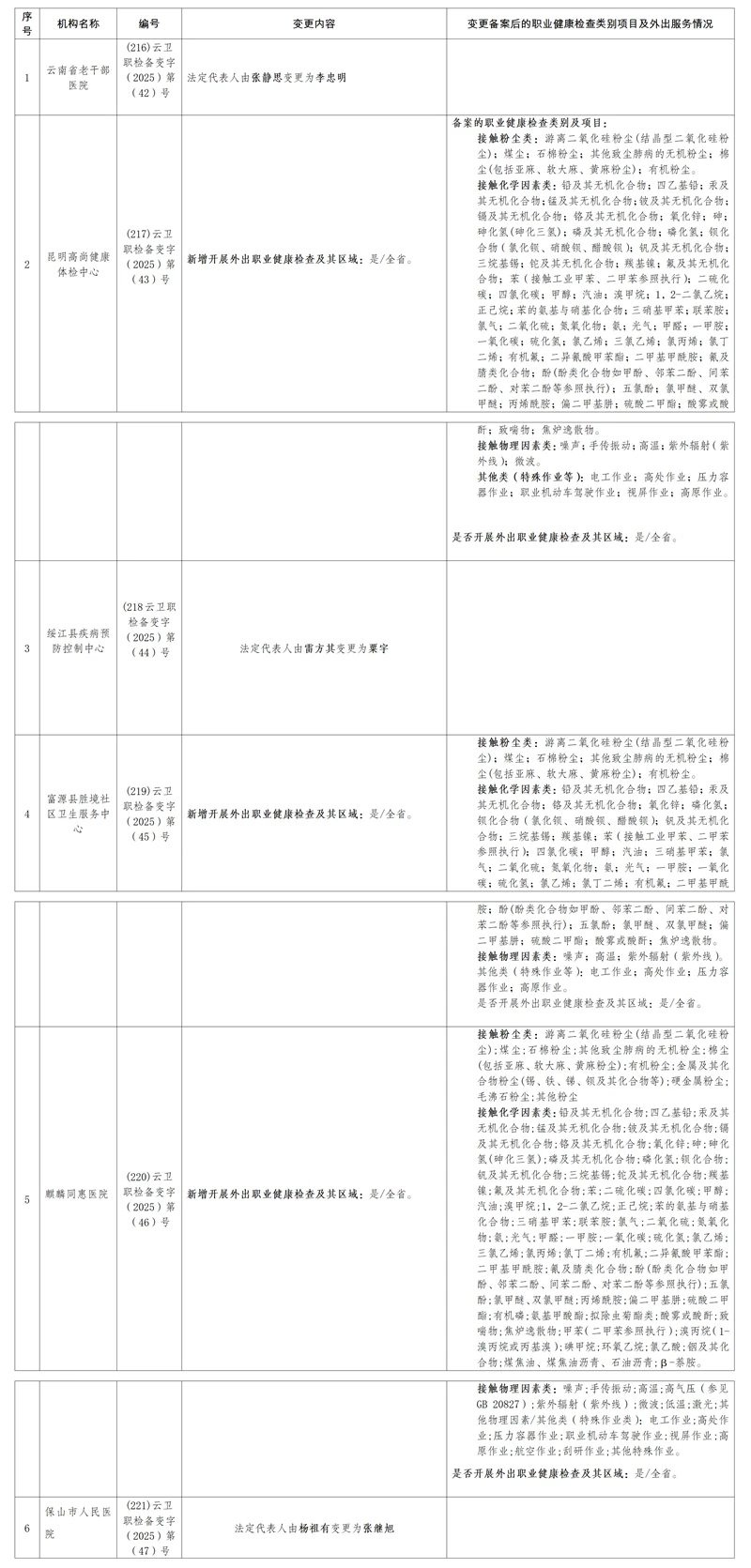 2025年12月云南省职业健康检查机构备案变更名单