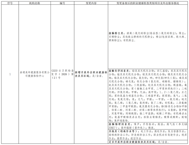 2026年2月云南省职业健康检查机构备案变更名单